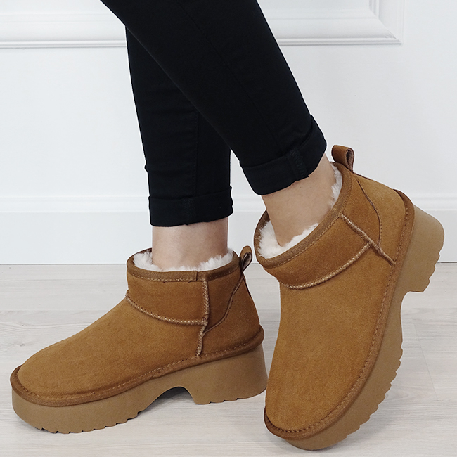 Ghete camel îmblănite din piele întoarsă naturală, Interiorul este căptușit cu blăniță de lână, Talpă groasă din cauciuc zimțată. Vârf rotund. Model cu calapod mic se recomandă alegerea unei mărimi mai mari decât cea uzuală....